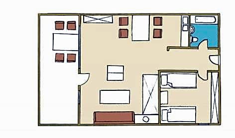 This spacious three-bedroom apartment has a furnished terrace with wonderful sea views. There is an airy lounge with a TV and sofa bed, and a kitchenette with an oven, electric hob and fridge.
